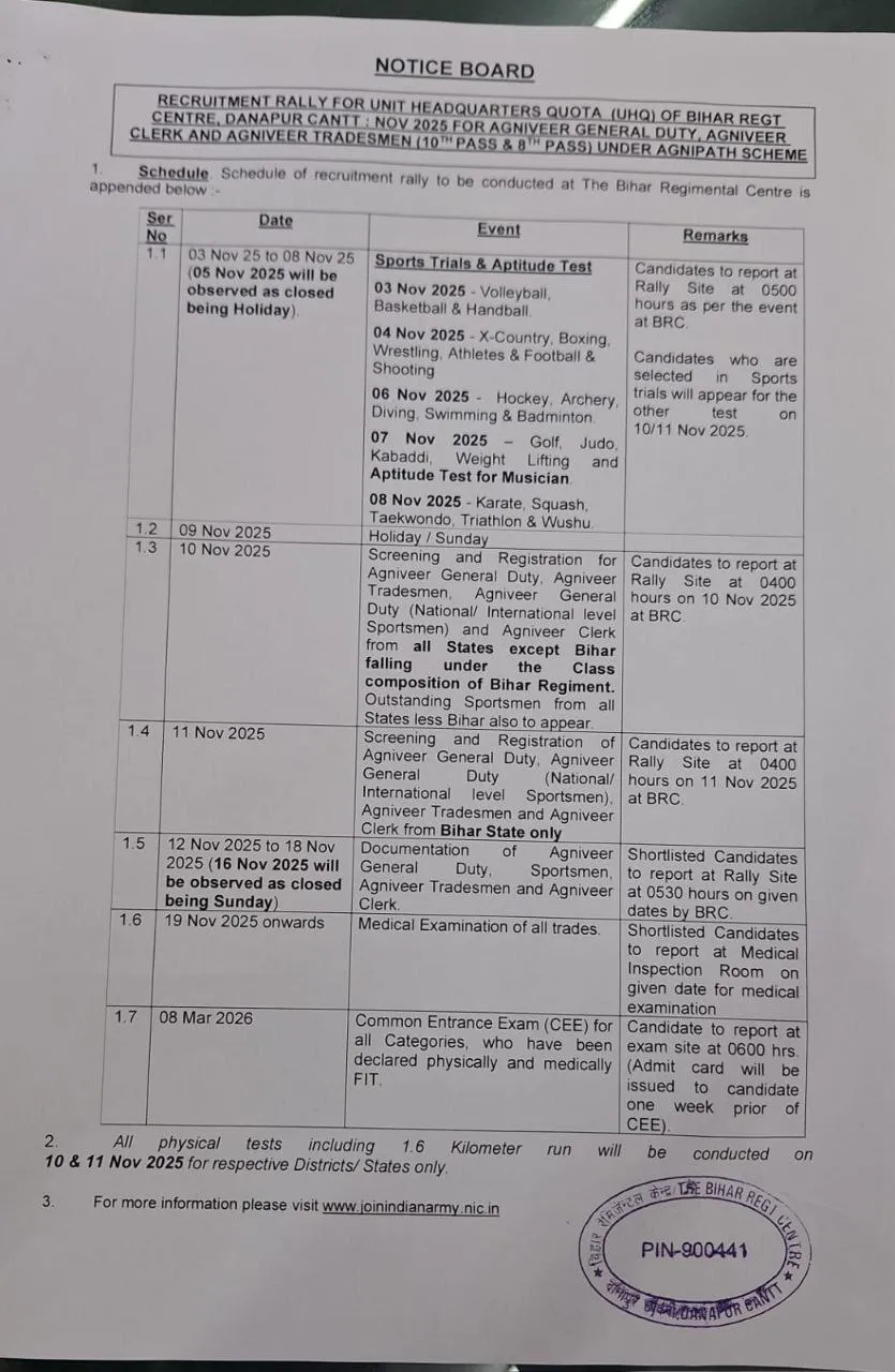 Important Dates Bihar Regiment Relation Bharti 2025