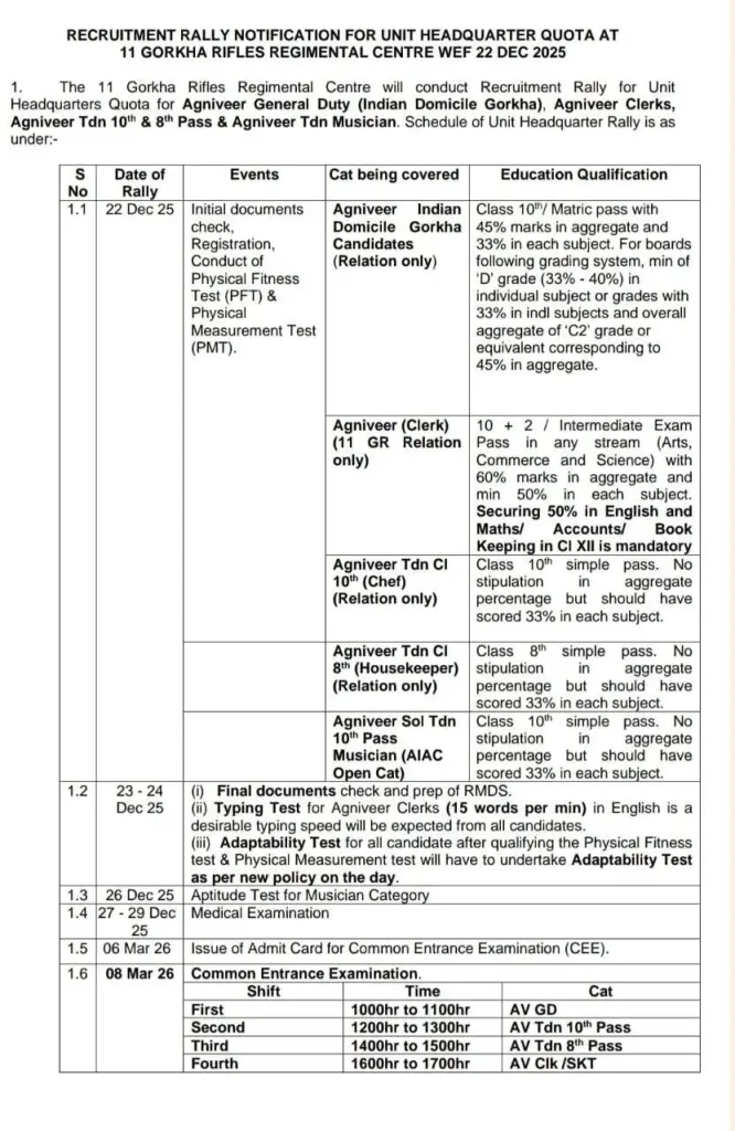 Gorkha Rifles Recruitment 2025 Notification: The Indian Army has released the official notification for 11 Gorkha Rifles Regiment Centre Lucknow Relation Bharti 2025. This recruitment rally will be conducted for various posts including Agniveer GD, Clerk, Tradesman, and Musician. Candidates from All India and All Castes can take part in this rally